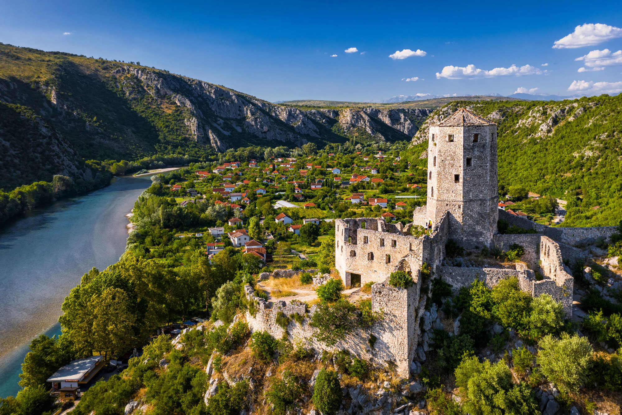 Mostar espera junto al río Neretva, con su puente tendido como un gesto de unión entre orillas y memorias compartidas. Jajce, Travnik o Pocitelj completan el relato con fortalezas, calles empedradas y una calma que parece ajena al tiempo.